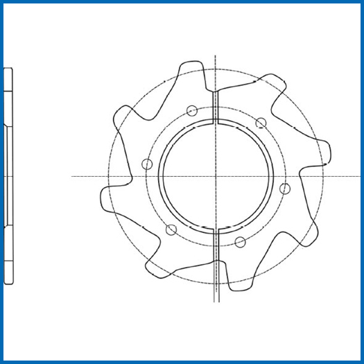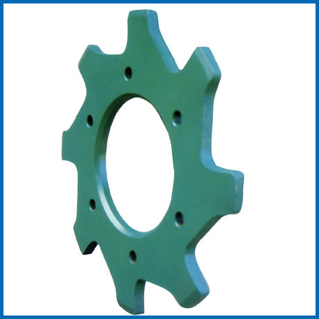 鏈輪適用于模鍛刮板鏈,鏈輪為雙片,中間配有輪轂,輪片裝配在輪轂上,裝配方便,輪片整體調質,齒部高頻淬硬,使齒部的硬度較高,更具耐磨性。