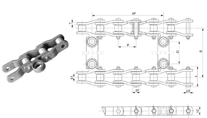 | 鏈號 | 節(jié)距 P (mm) | 內(nèi)寬內(nèi)節(jié) b1 (mm) | 滾子外徑 d1 (max) (mm) | 銷軸直徑 d (mm) | 銷軸長度 L (mm) | 鏈板高度 h (mm) | 鏈板厚度 T (mm) | 抗拉度 Q (min) (KN) | 許用工作 載荷 (KN) |